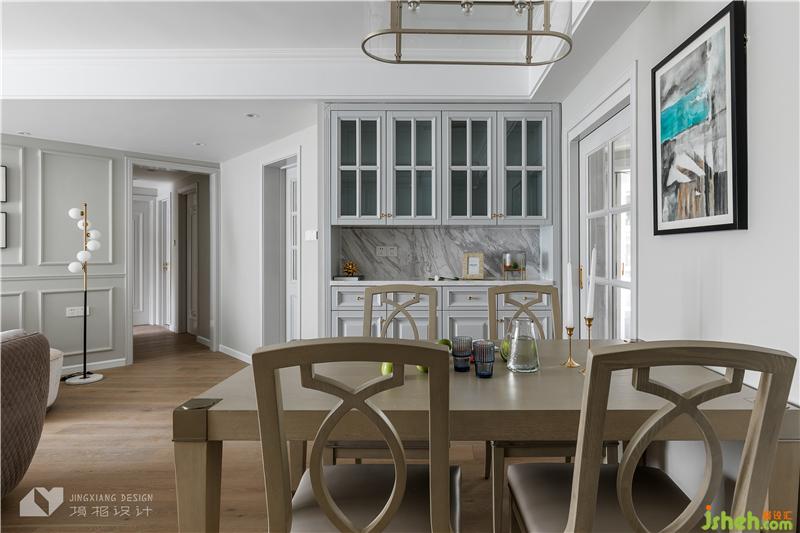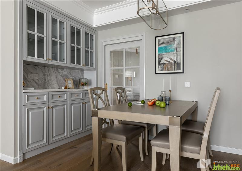 餐廳空間有限,便沒有設(shè)計(jì)過(guò)多的元素??繅Υ蛟煺懦鲕売脕?lái)做收納,玻璃+線條的組合提升柜體的輕盈感,也減輕柜體給空間帶來(lái)的壓力。室內(nèi)設(shè)計(jì)師