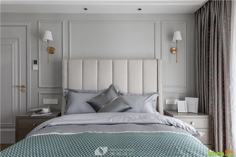 雙人床的床頭較高并且本身就富有腔調(diào),所以背景墻上就沒有做過(guò)多的設(shè)計(jì)。壁燈、線條刻畫出對(duì)稱美,又利用床頭柜的不同色彩打破這種對(duì)稱,找到二者之間的平衡。室內(nèi)設(shè)計(jì)師