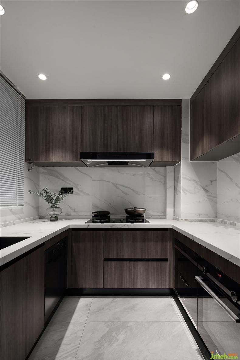 廚房內(nèi)木色櫥柜與大理石瓷磚吸人眼球,沉穩(wěn)且大氣。室內(nèi)設(shè)計(jì)師烤箱蒸箱洗碗機(jī)等設(shè)備均配備齊全,加上寬敞的U型操作臺(tái),讓喜愛烹飪的女主人可以盡情施展手藝。