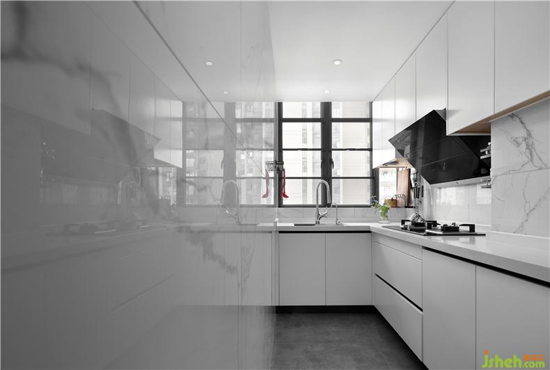 將生活陽臺納入室內(nèi)后,擴(kuò)大了廚房面積和可操作臺面,室內(nèi)設(shè)計師將布局設(shè)計成L型,動線順暢,儲物充足。良好的采光搭配純白的櫥柜,廚房空間明亮干凈,通透大氣。