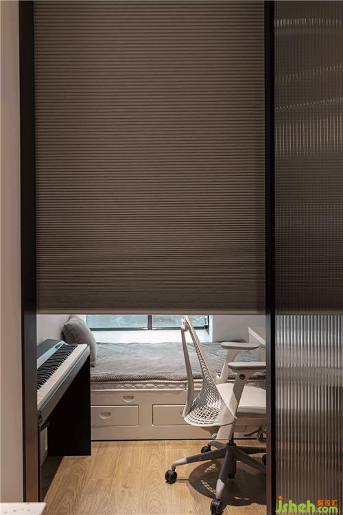 經(jīng)改造后,次臥成為書房兼客臥。入門處安裝有升降簾,需要時拉下來,更有私密感。