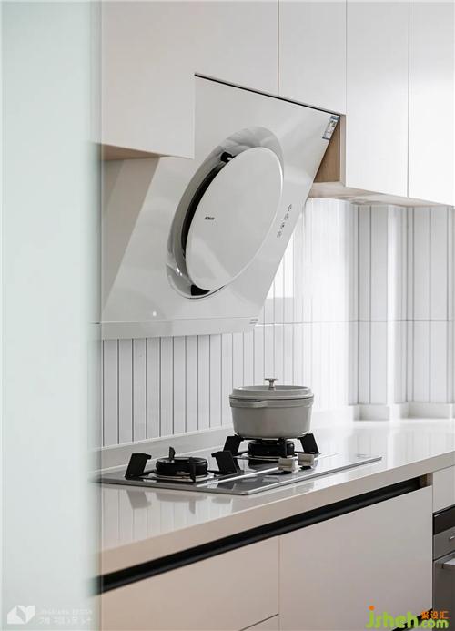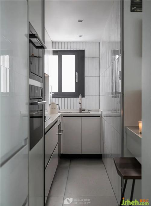 廚房以白色為主調(diào),進一步提亮空間。地柜懸空設(shè)計,削弱壓抑感。長條小白磚,線條感突出,令墻面立體而靈動,中和了純白的單調(diào)。