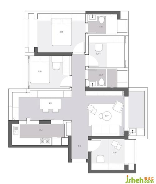 2.封閉餐廳陽臺,布置成西廚,分擔(dān)原有餐廳的壓力。