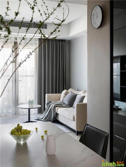 Pure floor tiles extend the line of sight. Morandi color fabric sofa makes the visual focus transition naturally. French windows give you a broad vision. In the afternoon, you can lean on the sofa and see the prosperity of the city through the window in the sunshine.