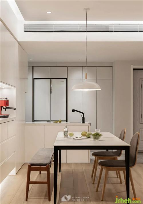 The custom-made sideboard cabinet is hidden and exposed. The coffee machine is placed in the open grid, and the installed light band is convenient for coffee making. A simple chandelier with northern European style above the dining table adds color to the food with light. Every meal is exquisite and pleasant.