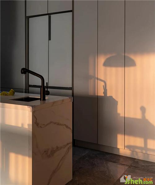 U型廚房?jī)?yōu)化生活動(dòng)線。根據(jù)梁體合理布置整面儲(chǔ)物柜,掩蓋空間缺陷,視覺上更加統(tǒng)一。島臺(tái)采用大理石材質(zhì),既可做水吧臺(tái),深圳室內(nèi)設(shè)計(jì)師也能做西廚處理冷食。