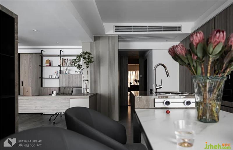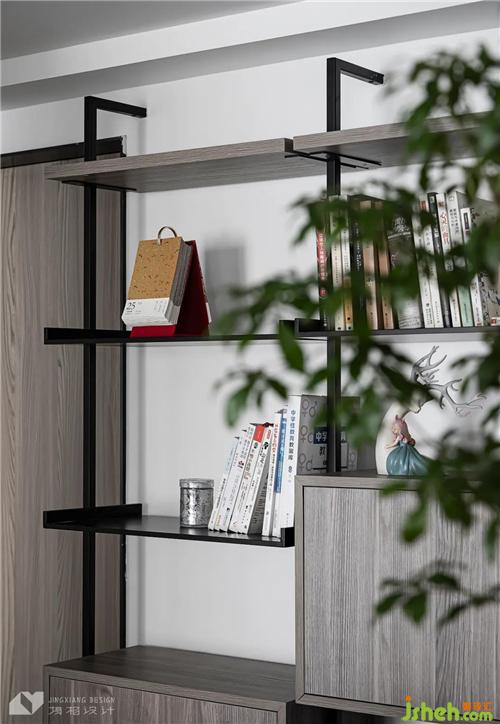 利用L型書(shū)桌,巧妙劃分出空間界線,營(yíng)造書(shū)房私密感。開(kāi)放式書(shū)柜,造型輕盈,與開(kāi)放格局深度融合,形成整體感。