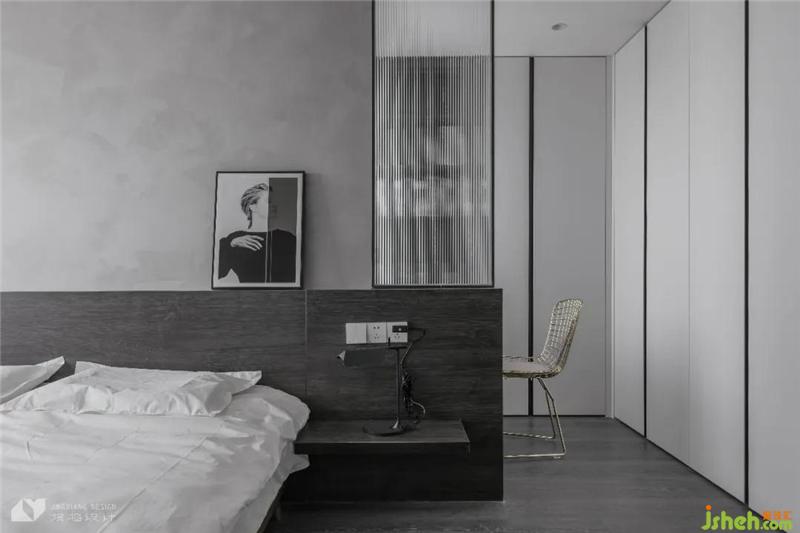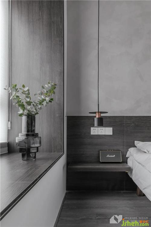 床頭設(shè)計(jì)置物臺(tái),代替笨重床頭柜,功能不減,視覺(jué)卻更顯輕盈。上方預(yù)留插座盒開(kāi)光,方便使用小電器,冷調(diào)空間中不乏人性化考慮。一盞小吊燈,讓睡前看書沒(méi)有背光煩惱,照亮床頭之處,也照亮心靈一角。