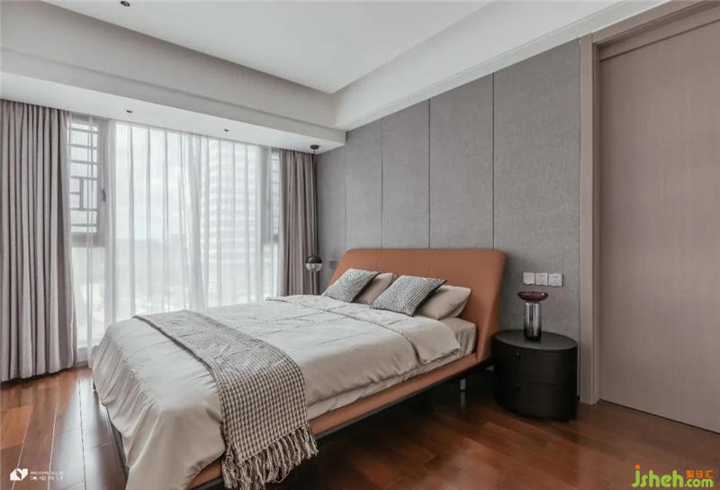 Low satiety orange is selected for bedding, which echoes with the floor. Orange is placed in the gray space, which also enhances the three-dimensional feeling of the space. Considering the area of the second bedroom, the layout is simple to avoid space congestion.