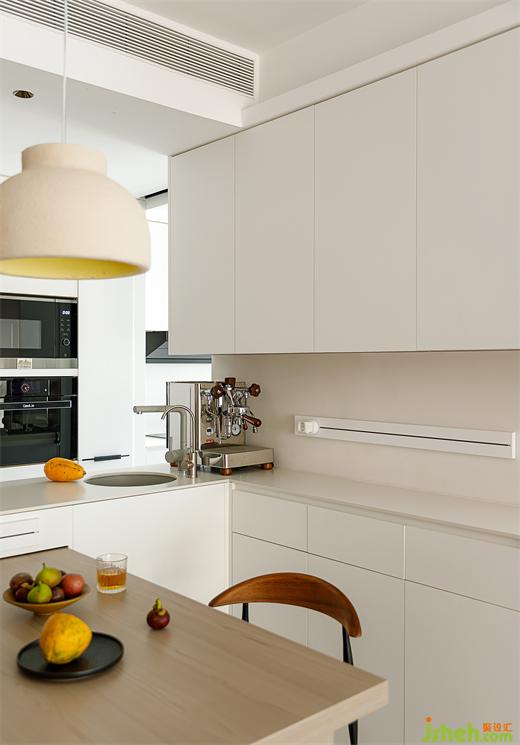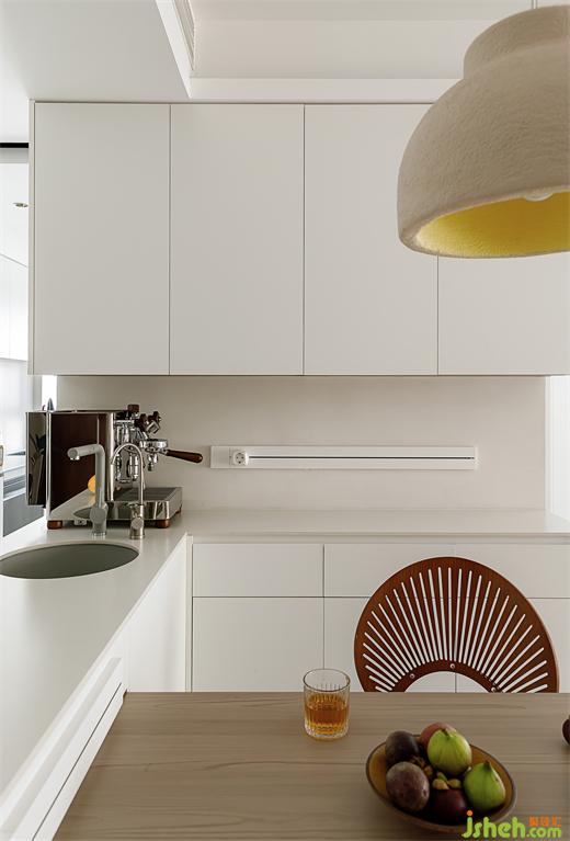 原本的廚房特別小,不足以滿(mǎn)足日常生活所需。境相設(shè)計(jì)師將原廚房外移一點(diǎn)作中廚使用,原餐廳處增加西廚與中廚連接搭配使用,一扇移門(mén)靈活切換。