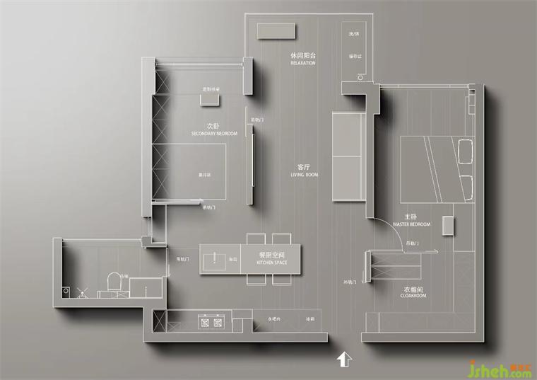 4、主臥設吊軌門,隔出獨立的衣帽間,一并實現(xiàn)空間的內(nèi)外聯(lián)動,構(gòu)建趣味的環(huán)形動線。