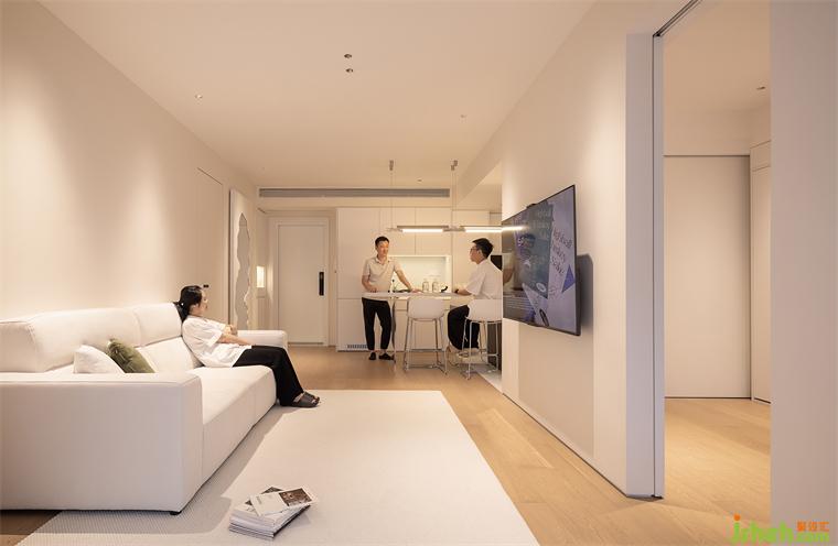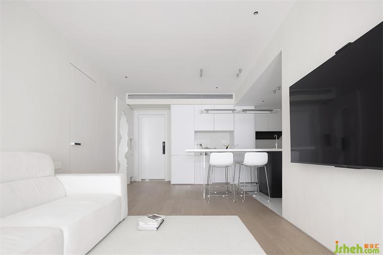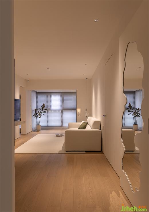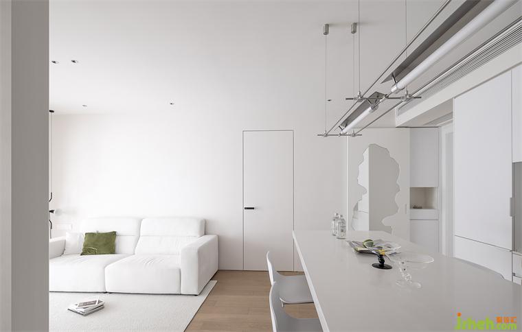 客廳以極簡純白為導向,回饋屋主對干凈純粹家宅的向往,白色藝術漆由墻及地,配合隱形踢腳線的處理,空間被包裹成純凈無暇的國度,而小家所需要的溫馨感,家裝設計則順由木色地板,延展至家的深處。#客廳#藝術漆#隱形踢腳線
