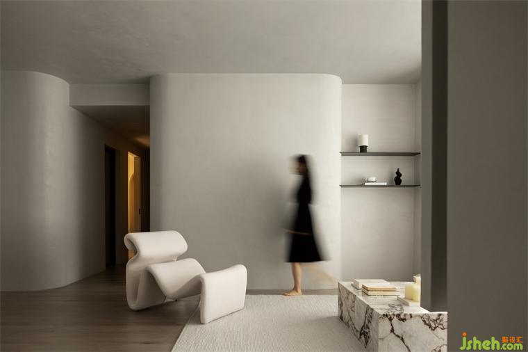 米色與淺色軟裝的搭配試圖尋找一個支點來達到舒緩的美學平衡,相悖的圓潤與直線只為消除空間界限感,營造舒適的流動空間。