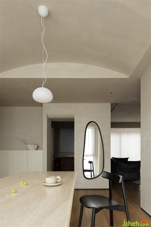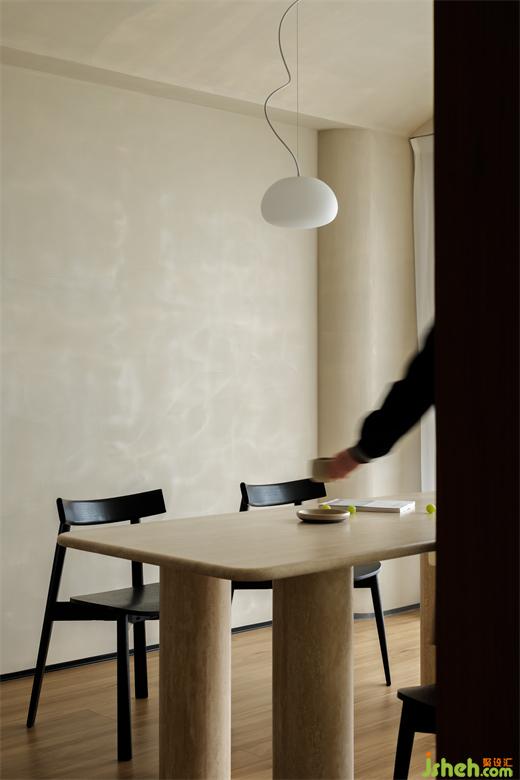 在空間體塊中不停重疊切割,弱化方正餐廳的僵硬感,裝修設(shè)計(jì)圓潤(rùn)吊燈與吊頂相輔相成,勾勒出這個(gè)用餐空間。陽(yáng)光穿過(guò)玻璃,落在紗簾縫隙,落在餐桌,隨著光線變幻仿佛可以觸摸到一寸寸時(shí)間的流動(dòng)。