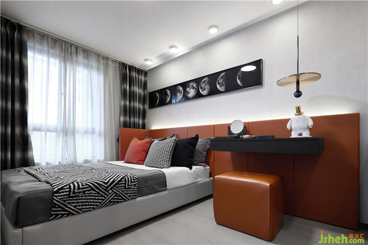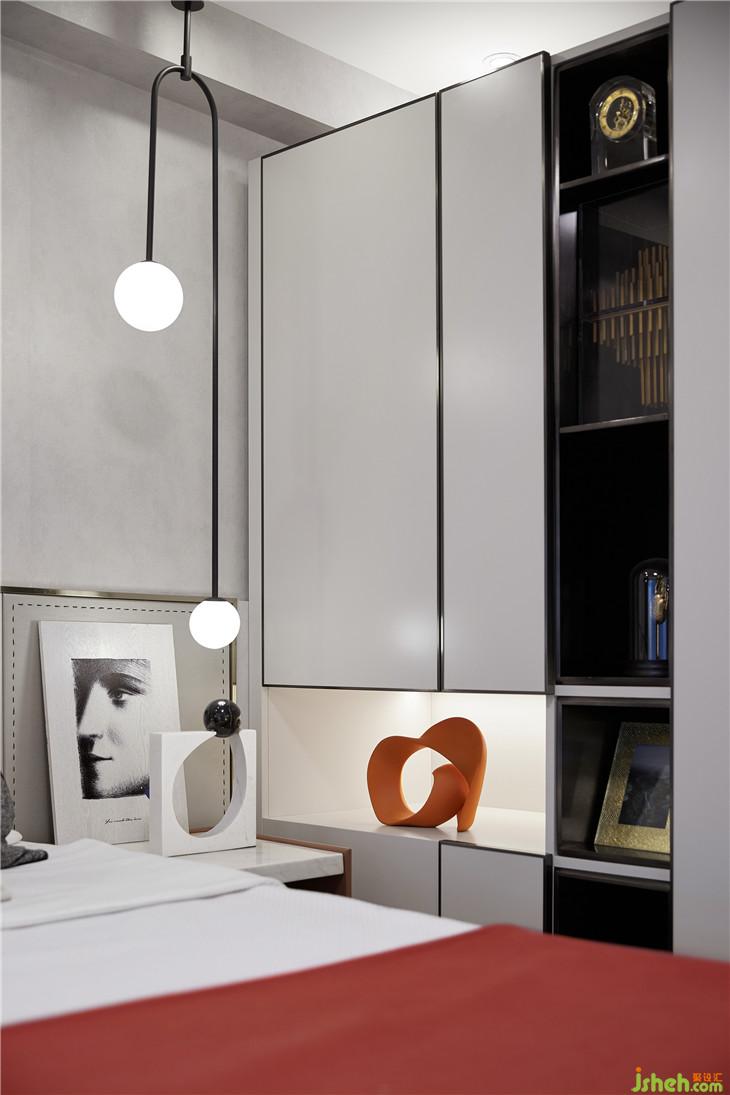 主臥用視覺(jué)上跳躍又不刺眼的赤茶色,調(diào)動(dòng)了主色調(diào)灰色的沉穩(wěn)。兩處線(xiàn)條簡(jiǎn)潔卻不乏味的燈飾提升了整個(gè)空間的律動(dòng)感,仿佛燈光不是打在床側(cè),而是心靈的側(cè)面。