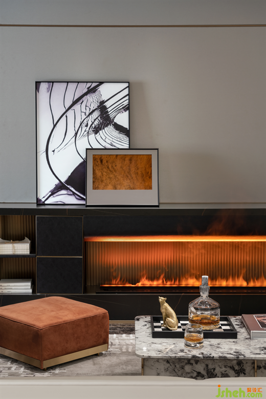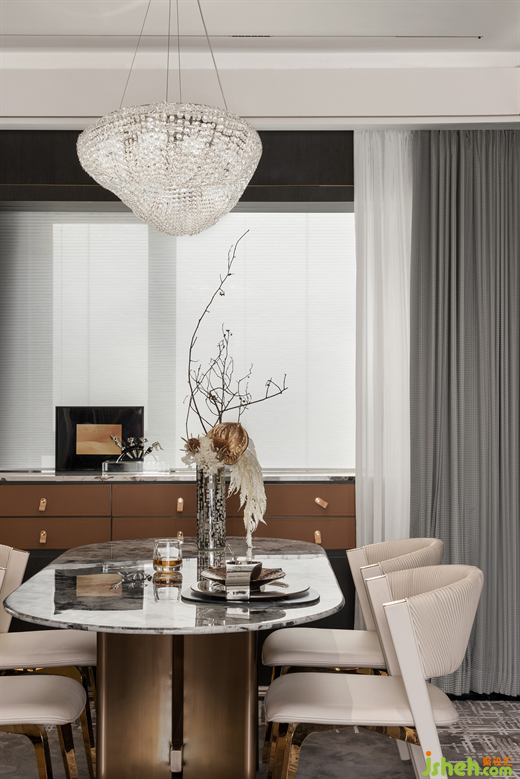 櫥柜打破傳統(tǒng)柜體皆安裝在天花以下的做法,利用燈槽的預(yù)設(shè),結(jié)合燈帶,樣板房設(shè)計營造一種直沖“云霄”的高闊感。廚房采用半開放式設(shè)計,令空間更加舒展之余,與餐廳的聯(lián)動性得以拉近。餐桌與島臺形成一體,組合使用,即構(gòu)成頗具浪漫情調(diào)的一角,滿足小酌怡情的待客所需。設(shè)計師擅用場地條件,將超大的飄窗改裝成餐邊柜,不僅可以承載收納、小吧臺的功能,亦與餐桌、島臺圍構(gòu)成一個整體的生活能量場域,鋪敘更具煙火氣的真實場景日常。