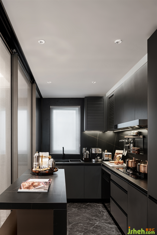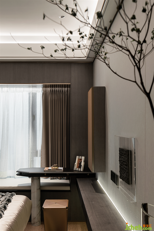利用飄窗順勢(shì)設(shè)計(jì)了一張小書桌,創(chuàng)造一處靜謐的悅己角落。奢華與靜謐于此同頻共振,折射著生活與藝術(shù)的關(guān)聯(lián)互動(dòng)。
