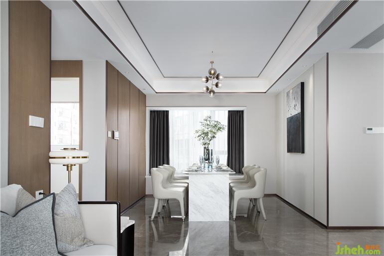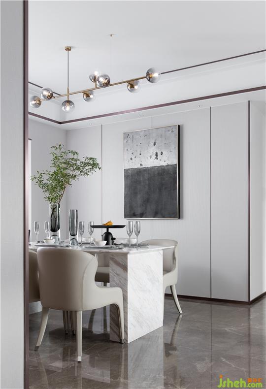 開放式餐廳與客廳相連,形成了簡明通透的空間格局。樣板房設(shè)計選用白色花紋大理石,搭配淡雅的米色座椅,并以清新的自然綠植為襯托,彰顯出高級輕奢的美學(xué)氛圍,搭建起一家人精致的三餐四季。