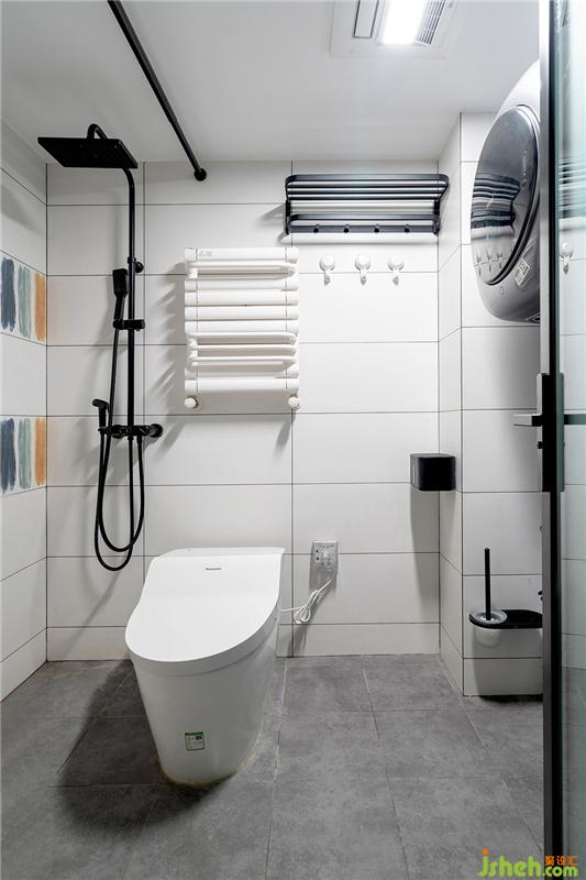 衛(wèi)生間過道全景,黑色鈦鎂合金磨砂玻璃門,與白色瓷磚形成了黑白配。衛(wèi)生間整體以簡潔為主,搭配兩三片花色磚提升清新質感。