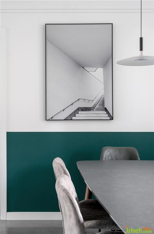 這個角度的餐廳空間感十足,簡約的吊燈和墻上的掛畫搭配起來,有一種簡單時尚的融合。
