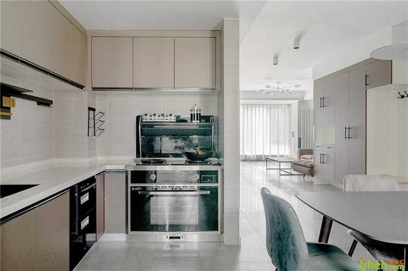 廚房采用了集成灶,0阻礙的頂部空間,可以實現(xiàn)完整的吊柜來儲物。同時集成灶的吸力也是非常大,就算是開放式廚房,家里平時燒飯,也不會有油煙味。