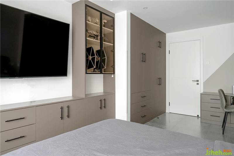 右邊是衣柜,所以深度比較大一些。因為一家人都有在臥室看電視的習慣,所以倆個臥室都配有壁掛的電視。顏色上以不同層次的幾個灰度營造氛圍,實際出來的效果達到了很舒適的高級感。