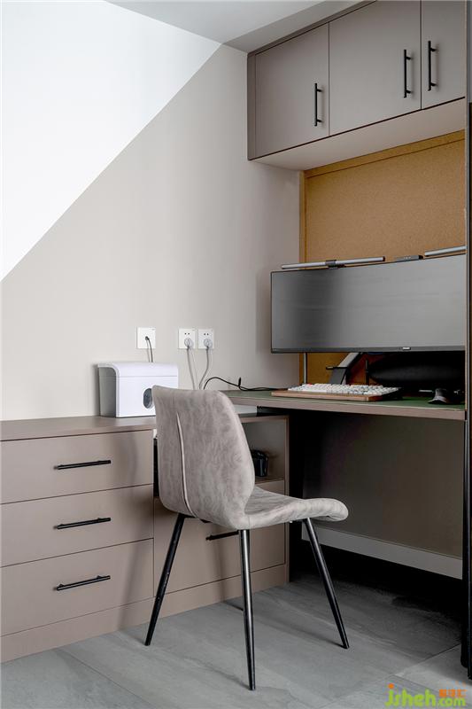 這個(gè)角度,灰色墻+軟木組合,在視覺上增添些許詼諧的趣味性。