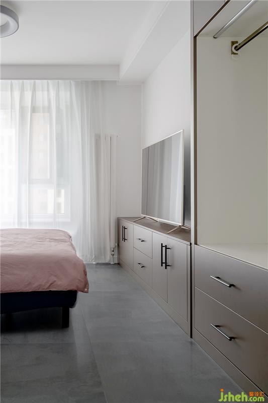 臥室的收納設(shè)計(jì)很重要,尤其像年長的老人,都會(huì)希望臥室有可以隨手掛衣的空間。所以在靠電視的這組柜子里,增加了一個(gè)掛桿,方便隨手掛放一些常用衣物。
