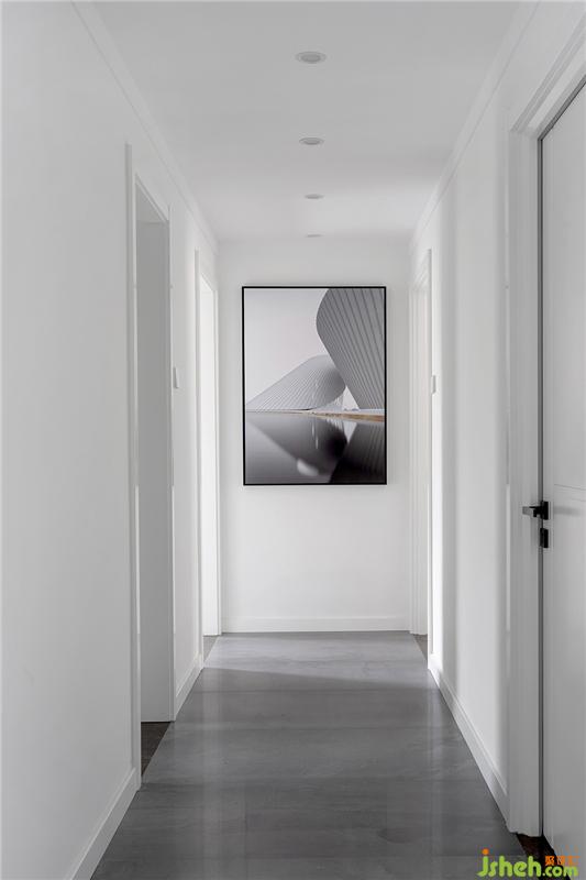 走廊作為家里每天進(jìn)出的必經(jīng)之地,顏值也是不必可少的。大面積的白色與不同位置的木門深淺是不同的。再配合頂面的燈光,光影效果下,這個(gè)區(qū)域產(chǎn)生一種空間美。配上一幅光影的建筑裝飾畫,整個(gè)走廊就被賦予了一種主題式的美感。