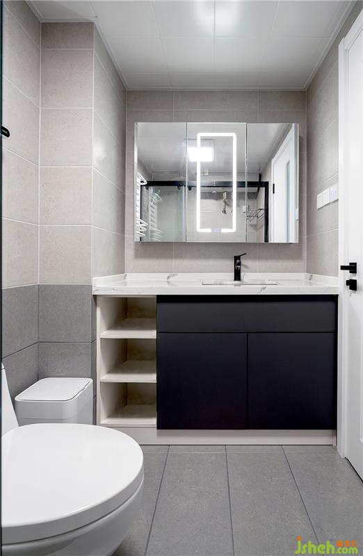 洗衣機(jī)和烘干機(jī)的上下水,電位要提前預(yù)留好,這樣才能做到美觀。地面是啞光灰的砂巖磚,一直蔓延到墻面半高,在視覺上也會(huì)把衛(wèi)生間延伸變大。