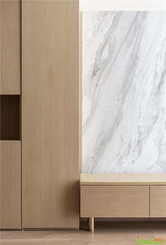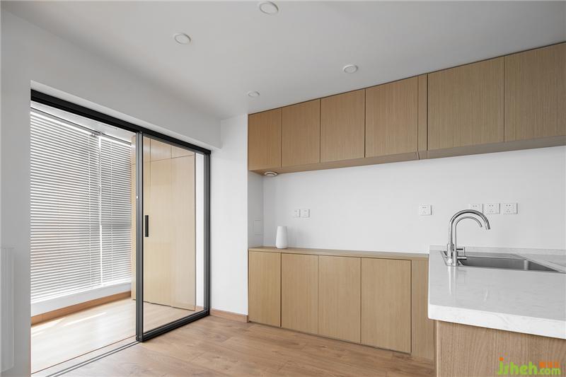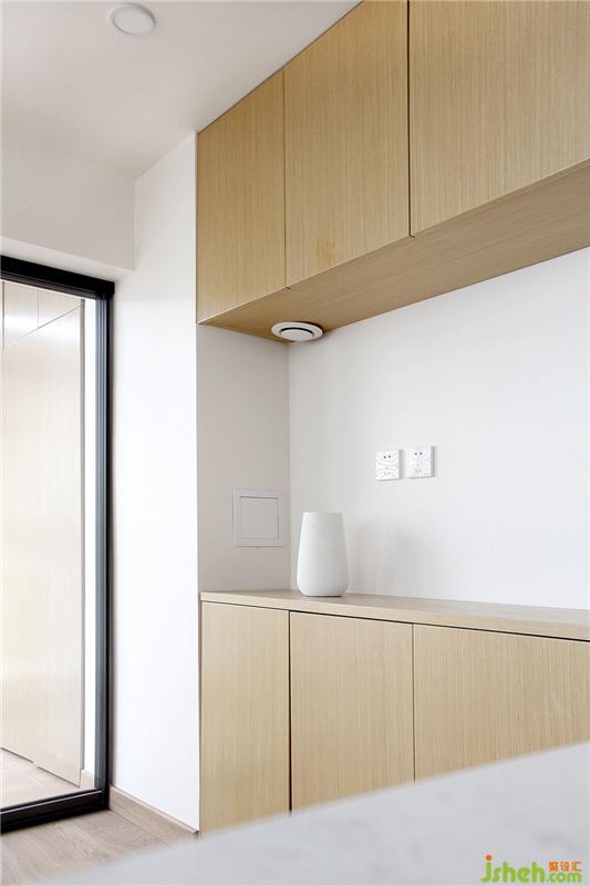 為了增添收納功能,陽(yáng)臺(tái)一側(cè)同樣做了整高收納柜,推拉門框架則選擇鈦合金材質(zhì),輕薄又美觀。