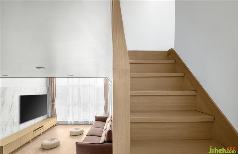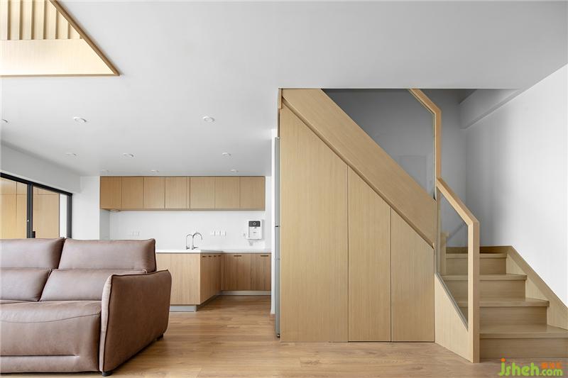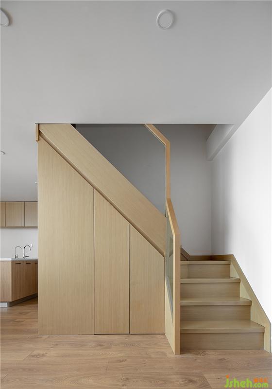 樓梯下方空間做了兩組儲(chǔ)物抽屜,增加客廳收納功能,抽屜安裝了回彈裝置,不留明顯把手與樓梯融為一體。