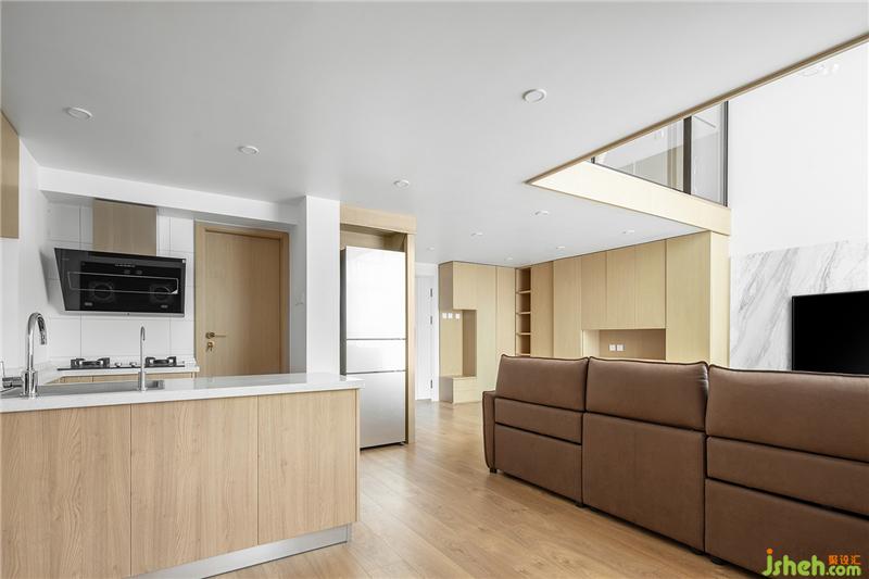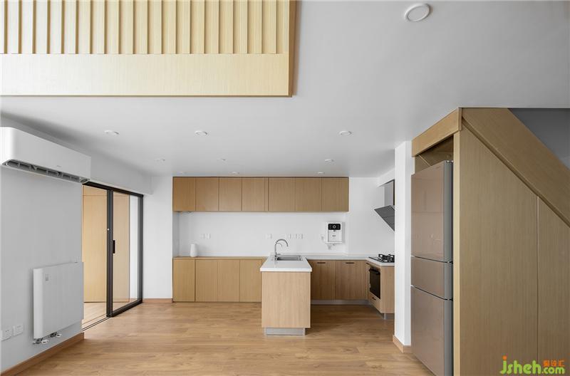 櫥柜同樣選擇與整體風(fēng)格相稱的木色,T字型的開(kāi)放式廚房,更合理的利用了過(guò)道空間。餐桌還在運(yùn)輸?shù)穆飞?,但已?jīng)可以想象出等安裝后就餐時(shí)一家三口其樂(lè)融融溫馨的場(chǎng)景。