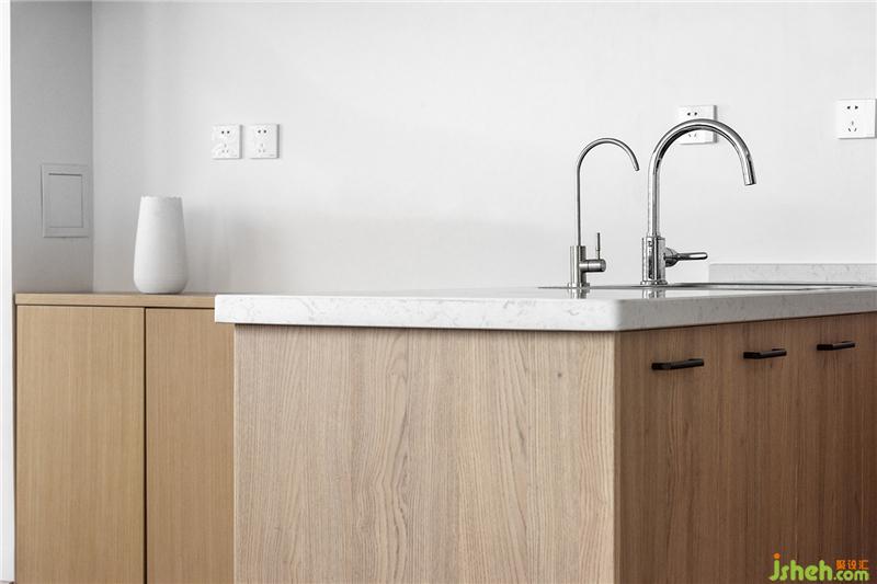 白色花紋石英石臺(tái)面搭配木色柜體,清新自然。合理設(shè)計(jì)插座點(diǎn)位,滿足多電器使用。