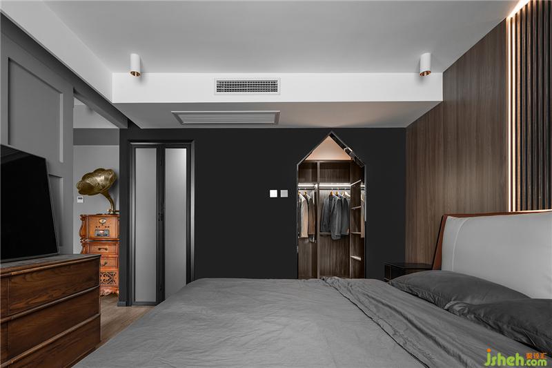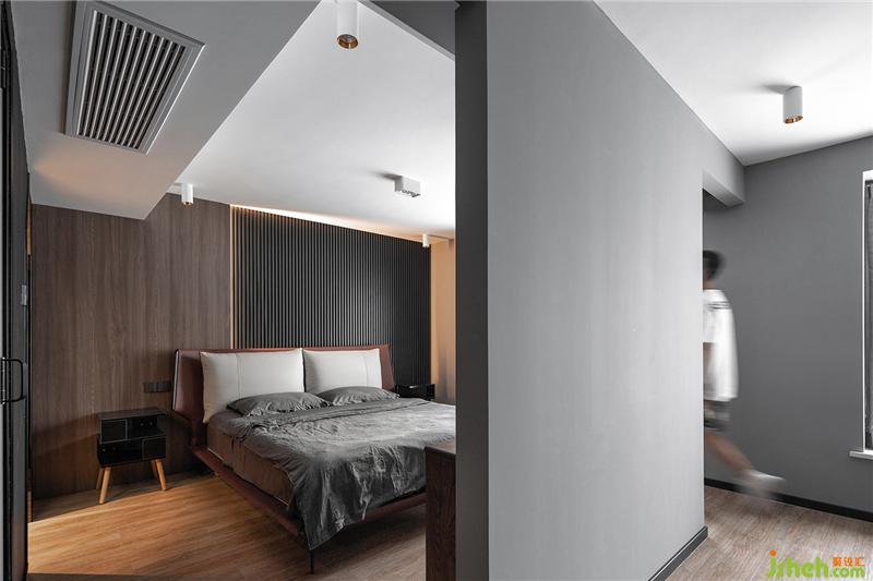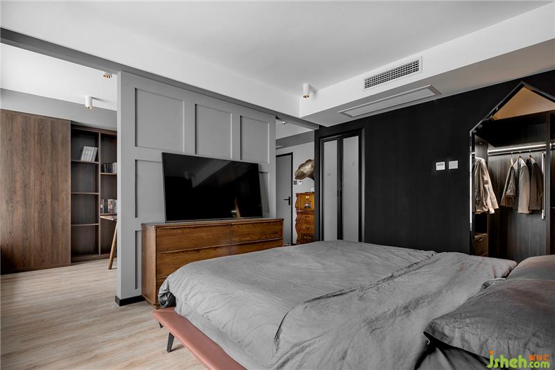 次臥滿足臨時住人與收納功能,放眼望去,滿眼灰色,處處充斥著高級感。