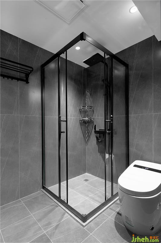 客衛(wèi)臨近馬桶位置安裝了與眾不同的方形淋浴房,規(guī)格為800*800mm。門的開啟形式選擇雙側(cè)推拉,既方便又節(jié)省空間。淋浴房方正中的線條美感搭配灰色墻地磚帶來現(xiàn)代風格的舒適感。