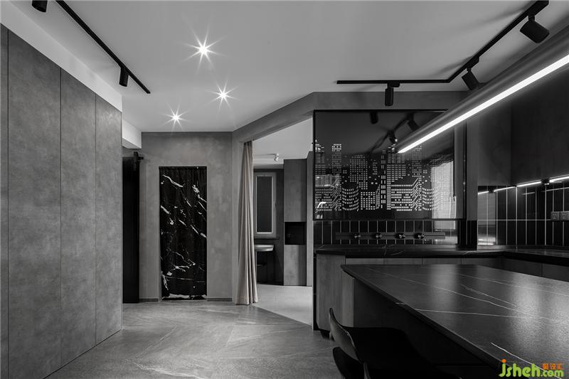 吧臺后方利用墻體做了到頂?shù)氖占{柜,中間留空部分可放置一些小擺件,儲物功能多樣化。石材吧臺與啞光石材地面反射出的光影給人帶來一絲高冷的氣息。