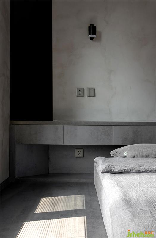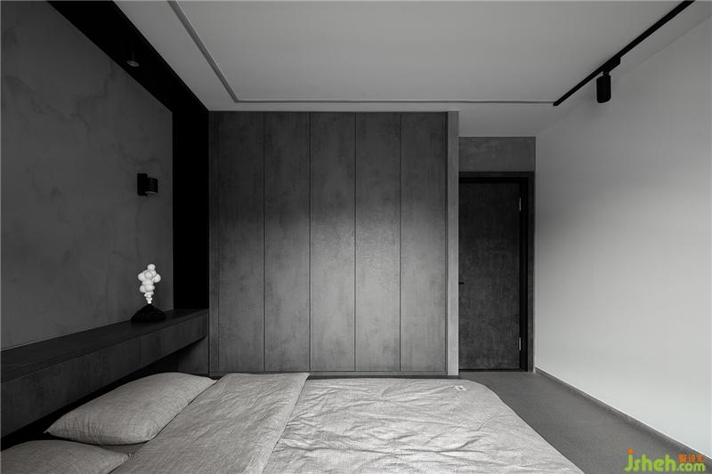 又是三種灰色系材質(zhì)搭配的空間。衣帽間柜門的鏡面效果反射產(chǎn)生的光線對空間進行提亮,搭配中間水泥色首飾柜時刻透露出優(yōu)雅的氣息。