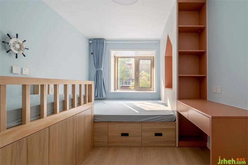 朝南的兒童房,定制了超大的榻榻米睡眠區(qū),旁邊加了獨(dú)立的單人床,輕松的容納下一家四口的睡眠空間。