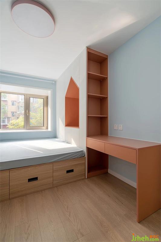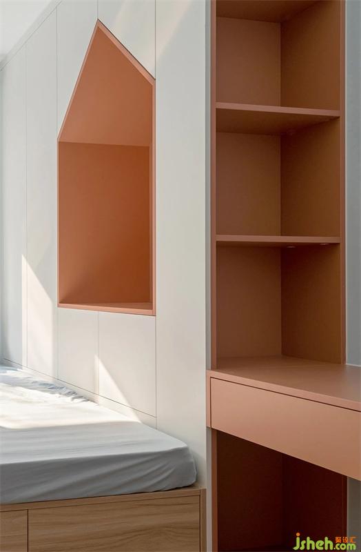 兒童房書桌還有敞開格做了橙色,飽和度相對高一些,跟墻面做一個(gè)強(qiáng)烈的對比,激活空間。