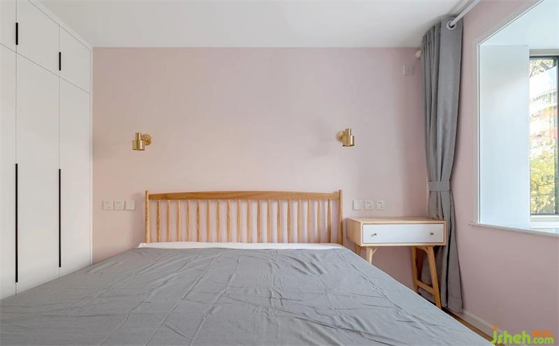 裝修設(shè)計(jì)應(yīng)屋主要求,墻面刷了女主喜歡的淺粉色。黃銅材質(zhì)的壁燈質(zhì)感還是很強(qiáng)的,床和梳妝臺都是購買成品。