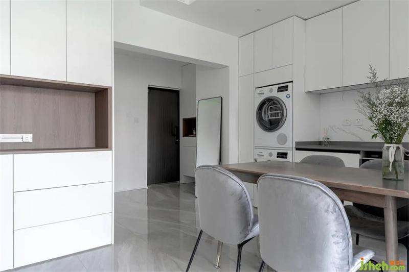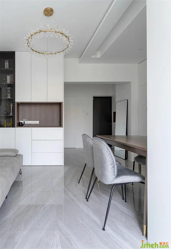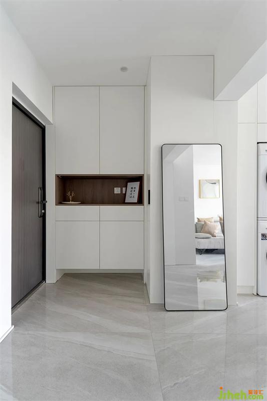 門(mén)廳區(qū)域進(jìn)門(mén)一側(cè)是鞋柜,中間開(kāi)放格方便屋主歸家后擺放包和鑰匙,上方空間預(yù)留出來(lái)給存放換季的鞋子。利用衣柜的寬度剛好可以安排穿衣鏡,方便出門(mén)整理衣冠。