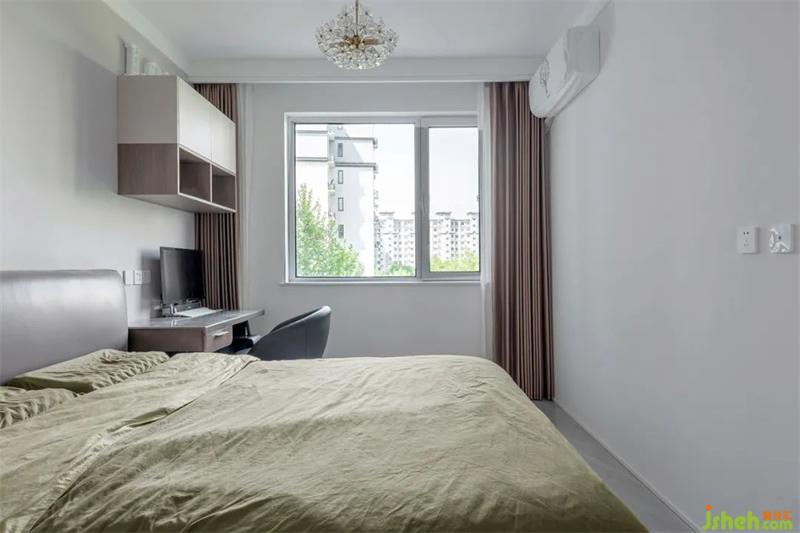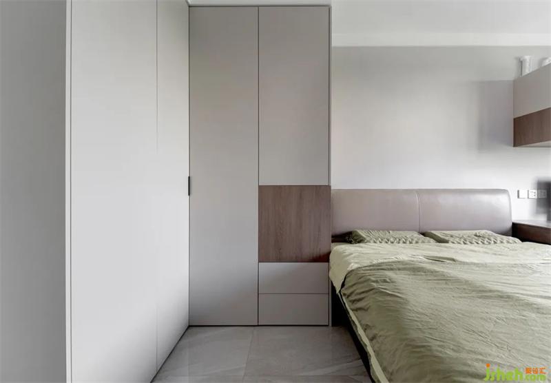 長(zhǎng)條形的主臥格局,為了可以更好的利用空間做了L型衣柜,床頭旁的開(kāi)放格,替代床頭柜的功能,最大化的增加儲(chǔ)物空間。