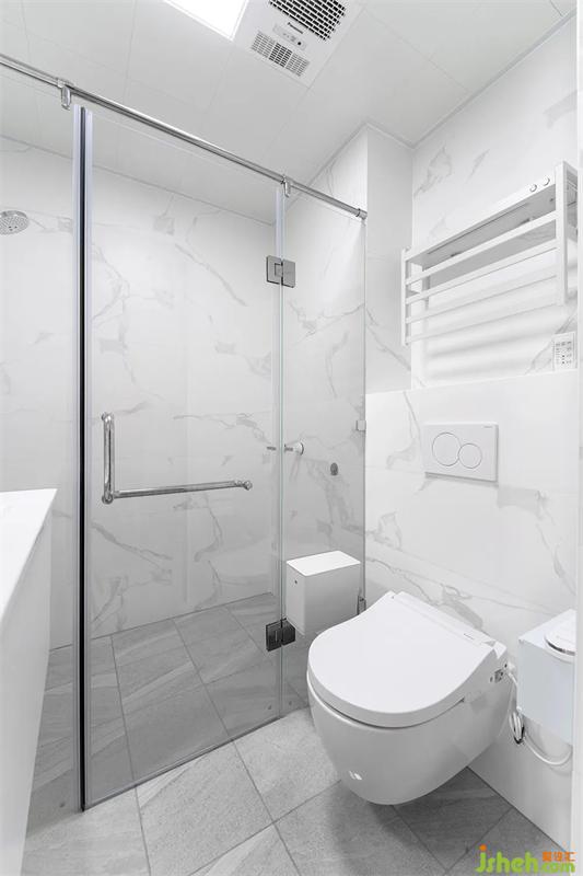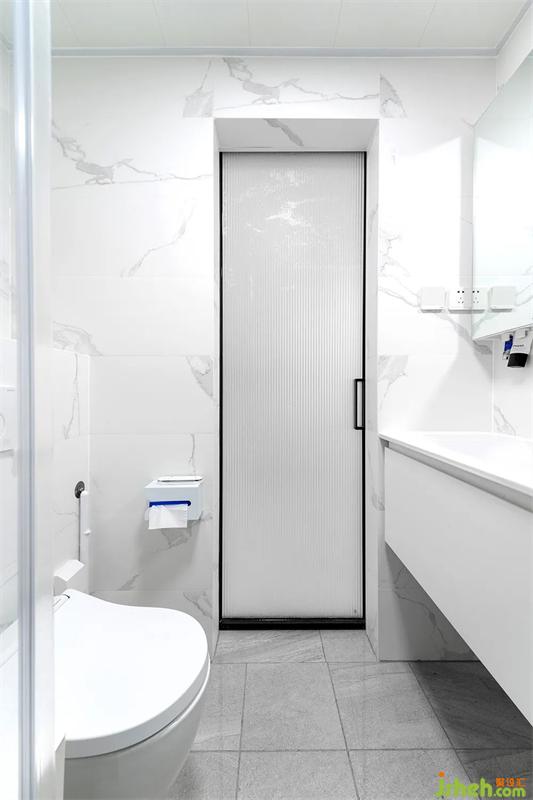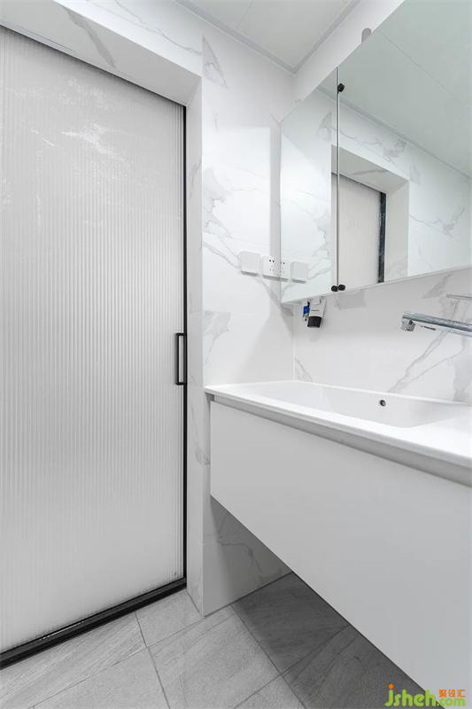 衛(wèi)生間的極窄邊金屬移門(mén),采用了雙層玻璃,長(zhǎng)虹+磨砂玻璃。500mm寬的陶瓷一體盆,臺(tái)下懸空方便清理地面。洗手盆上方制作鏡柜,增加儲(chǔ)物空間。