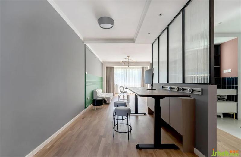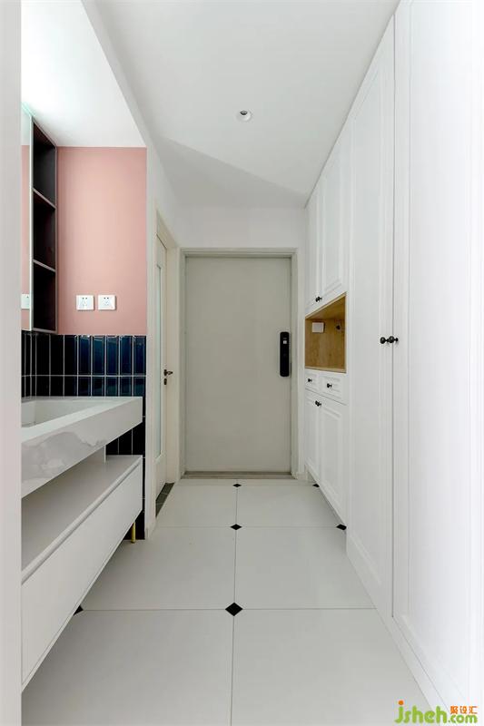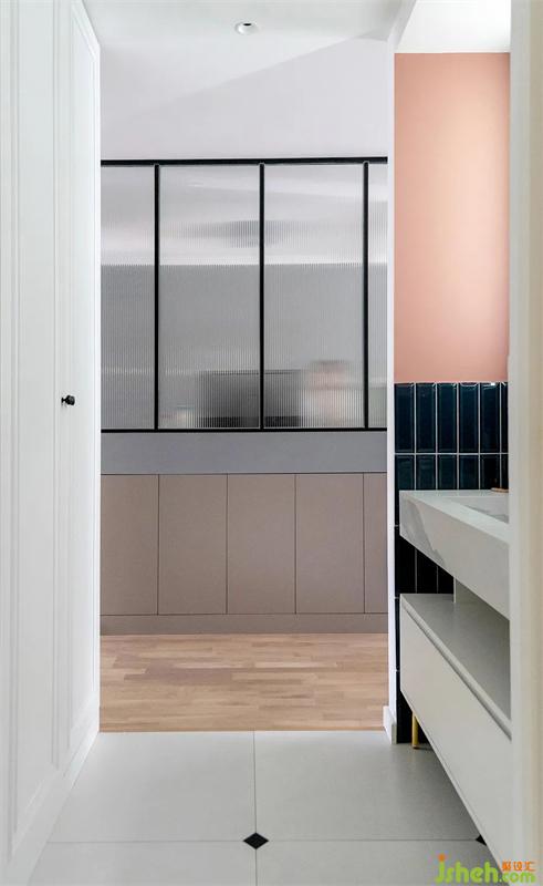 玄關(guān)一進(jìn)來,迎面看見的就是長虹玻璃+隔斷柜組合而成的屏風(fēng),阻隔視線私密性拉滿。北京裝修設(shè)計(jì)左側(cè)是玄關(guān)收納柜,右側(cè)則是干濕分區(qū)外置洗手臺(tái)。