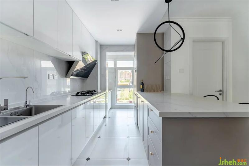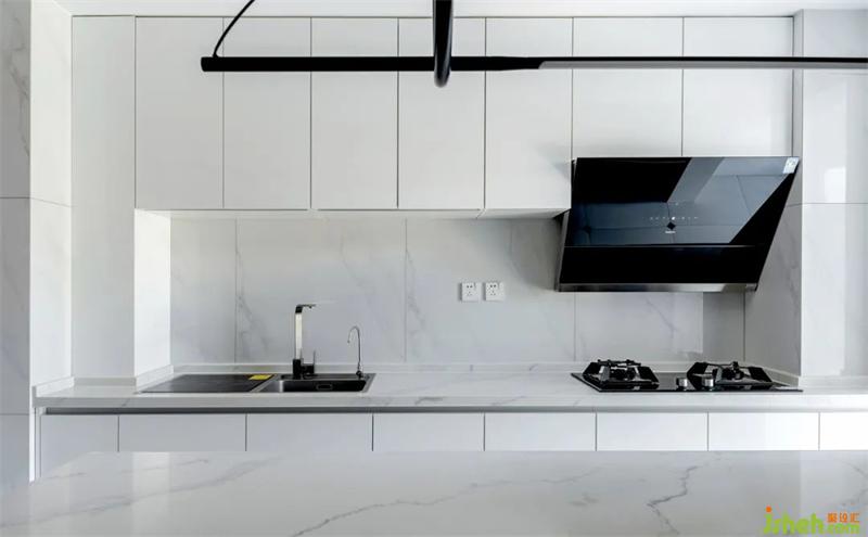 按壓式的柜門無把手,避免磕碰使用起來也更流暢。白色石材的臺(tái)面與墻面,搭配白色櫥柜,明亮的色調(diào)讓空間看起來更加寬敞潔凈。