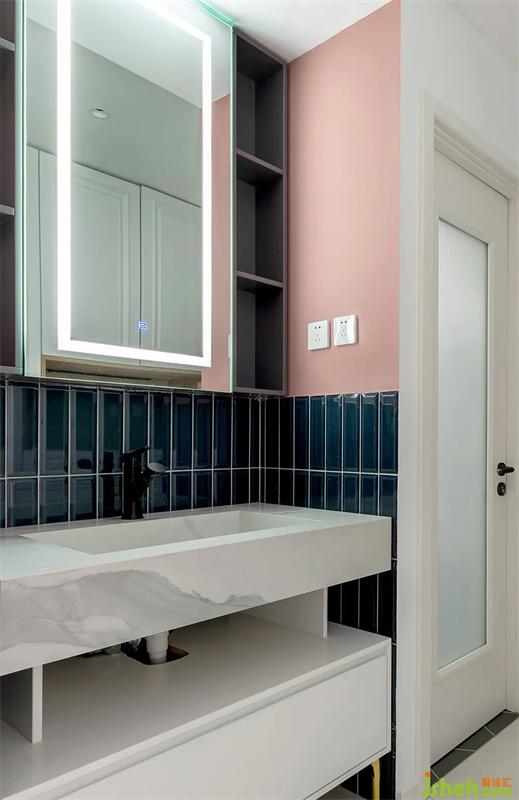 將洗手池外移進(jìn)行干濕分離,鏡柜以下采用的是藏藍(lán)色手工磚隔絕水漬,上面則是采用臟粉色。不摻雜任何的性別傾向,溫柔中又帶著些許高級(jí)感。