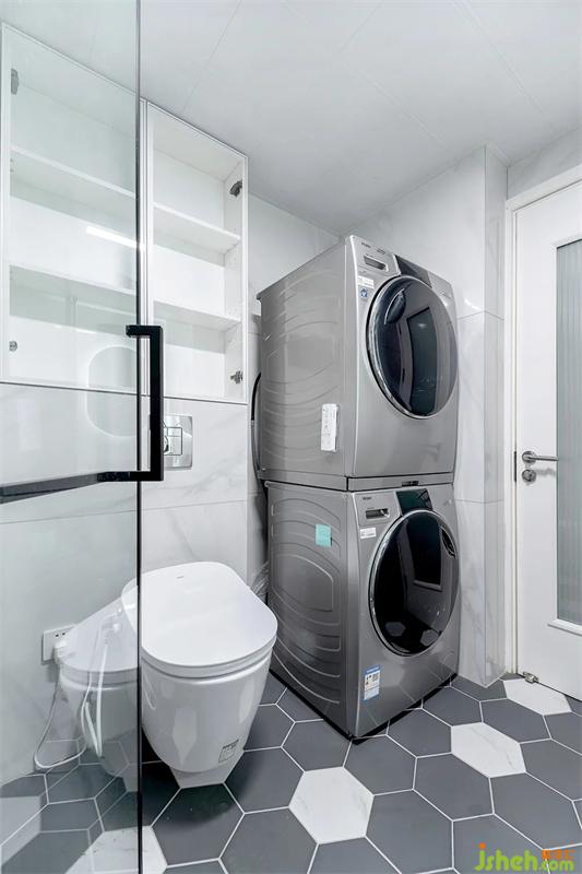 烘干機(jī)+洗衣機(jī)疊放,大大節(jié)省空間的占用面積。隱藏水箱的頂部空間也沒有浪費(fèi),定制了一組不小的收納柜,完美利用每一處空間。