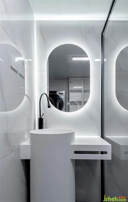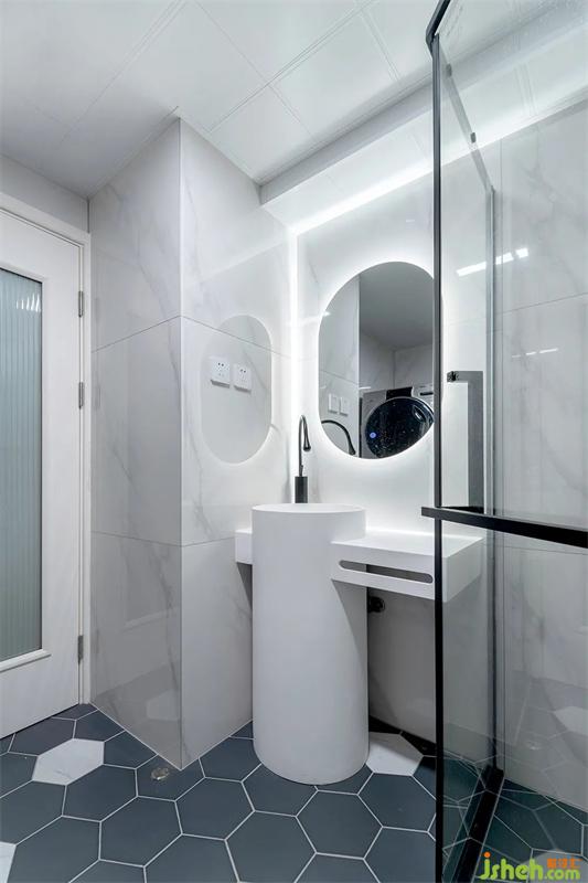 地面兩種顏色的六角磚進(jìn)行隨機(jī)鋪貼更顯高級(jí),墻面則采用白色的石紋磚進(jìn)行搭配。亮面瓷磚通過反射環(huán)境,給人一種科技感。