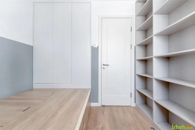 地臺(tái)替代床讓收納翻倍,床上面還有一組與墻內(nèi)嵌成一個(gè)面的衣柜。這樣墻地空間可以重復(fù)利用,將空間利用率發(fā)揮到極致。